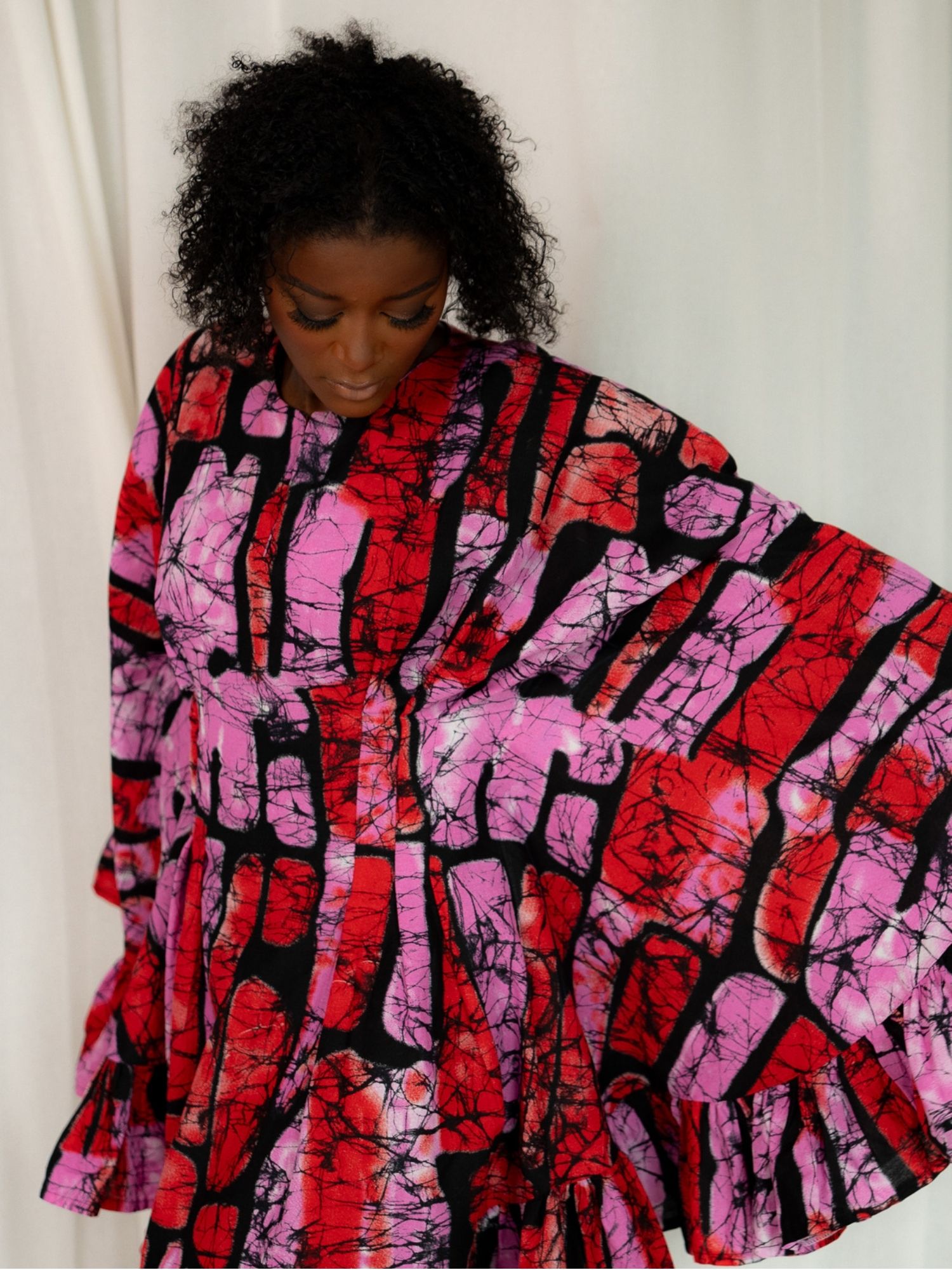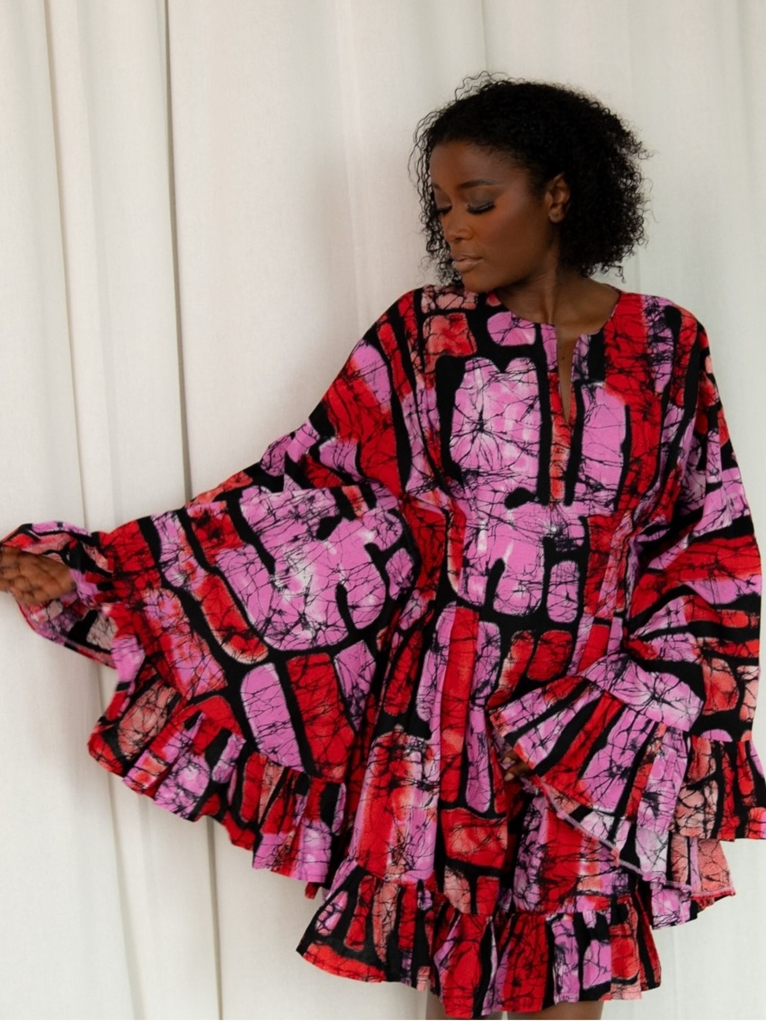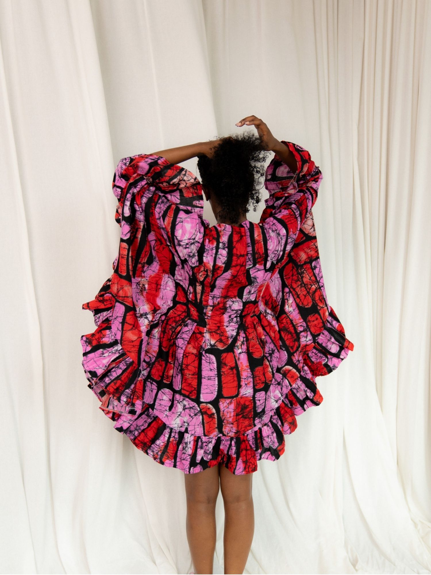 A celebration of freedom and femininity, the Amara dress is a voluminous mini crafted in a rich, dark cherry African print. Cut in our signature butterfly silhouette, it flatters the body with a softly structured shape and a cinched waistline, complete with a hidden internal tie that lets you define the fit to your liking.