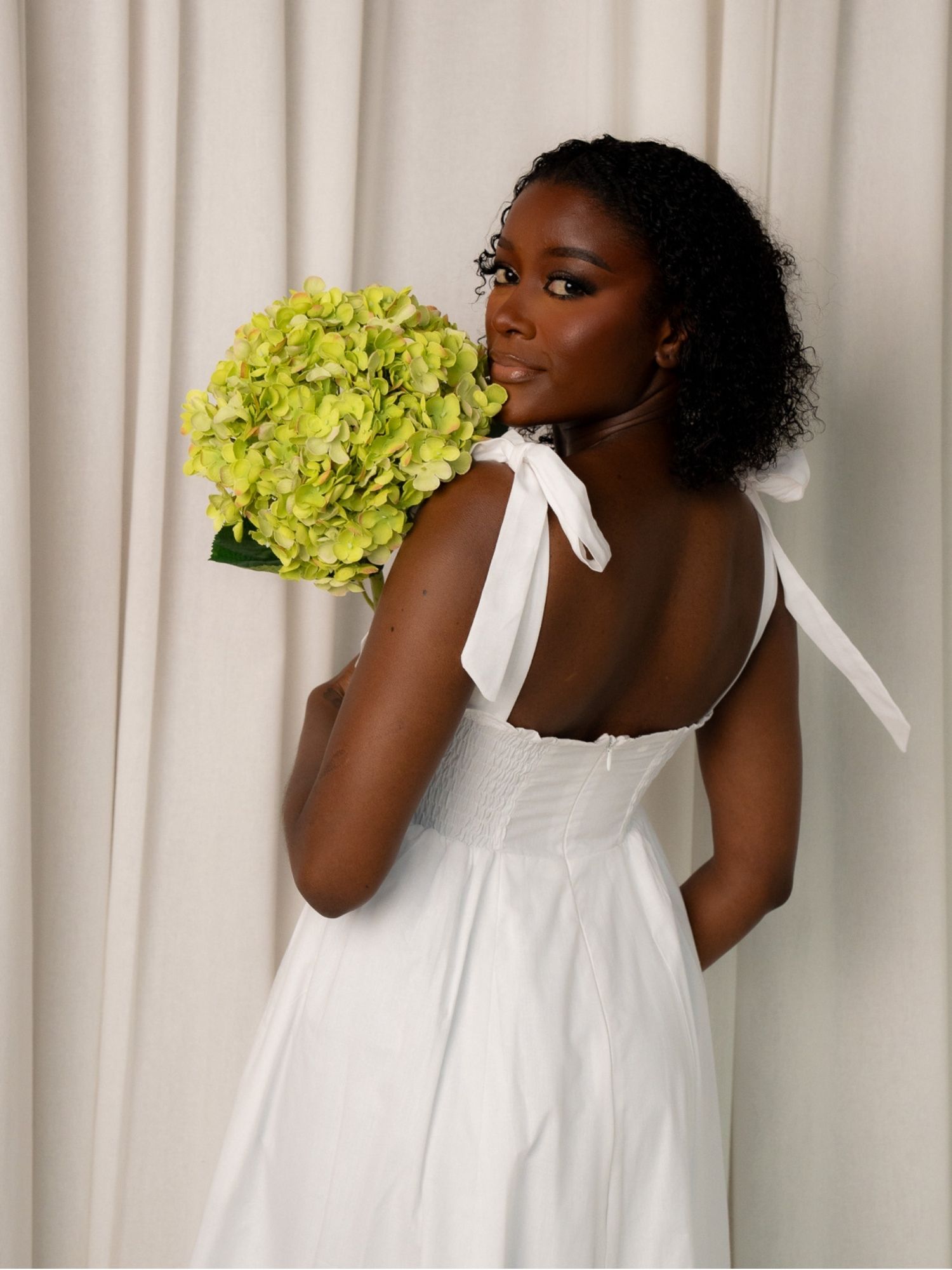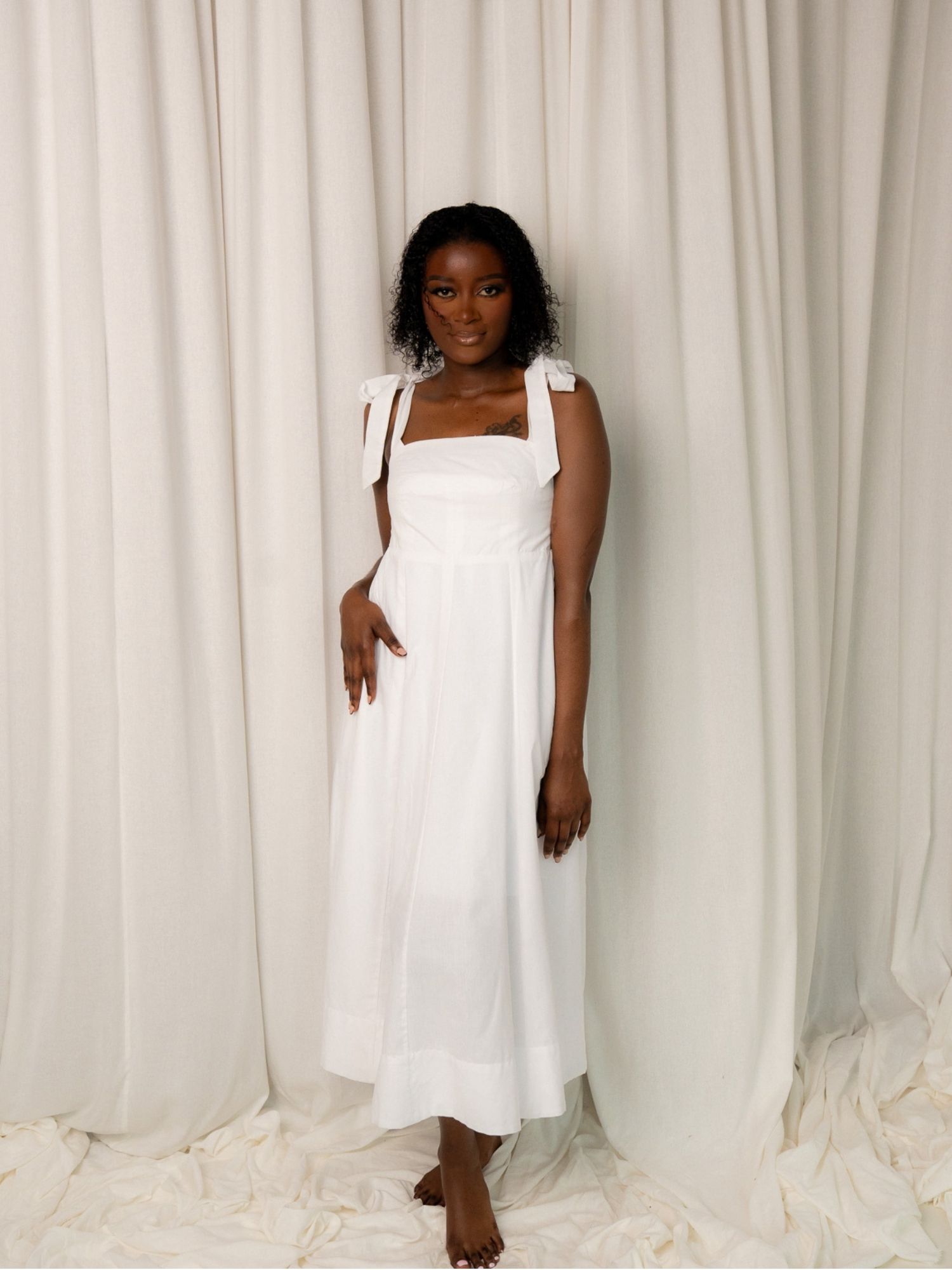 Crafted from breathable, structured cotton. It features wide self-tie shoulder straps, a flattering fitted bodice, and a flattering panelled skirt that grazes the ankles. The Cotton Ball hue brings a clean, elevated feel for summer events, garden parties and resort holidays.
