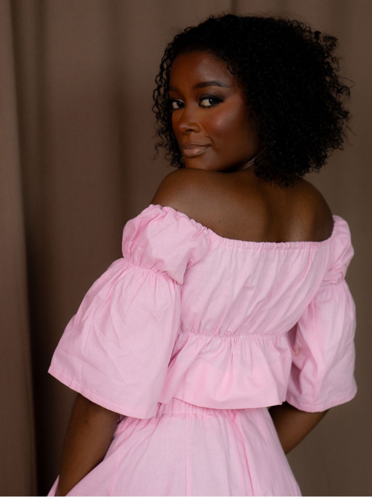 The off-shoulder top features delicate elastic shirring across the neckline, sleeves, and waistline, creating a subtly cinched silhouette with a romantic peplum flare.